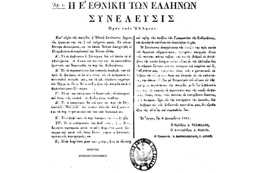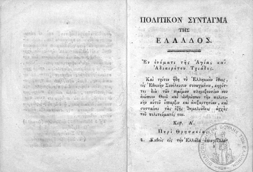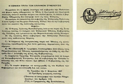 Η Γ´ Εθνοσυνέλευση στην Τροιζήνα ψηφίζει την 1η Μαΐου 1827 το Πολιτικόν Σύνταγμα της Ελλάδος. Πρότυπό του αποτέλεσε το αμερικανικό Σύνταγμα του 1787, ενώ το πολίτευμα που καθιερώνει αποτελεί μια παραλλαγή αυτού των ΗΠΑ. Πέρα από τον χωρισμό των εξουσιών και τον καθορισμό της εξουσίας του Κυβερνήτη, κατοχυρώνονται μεταξύ άλλων η ισότητα και η δίκαιη κατανομή των φορολογικών βαρών, η δυνατότητα πρόσβασης όλων των Ελλήνων στα δημόσια επαγγέλματα, η ελευθερία του Τύπου, η ανεξιθρησκεία, το απαραβίαστο της ιδιοκτησίας, και η μη αναδρομικότητα των νόμων. Καθιερώνεται όμως πάνω απ’ όλα η αρχή της λαϊκής κυριαρχίας.